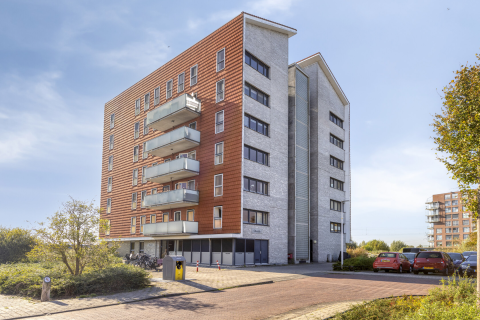 Aan de achterzijde bevinden zich 2 slaapkamers met openslaande deuren naar het balkon en de keuken welke is voorzien van diverse inbouwapparatuur. Vanuit de keuken heb je middels een openslaande deur toegang tot het ruime zonnige balkon gelegen op het zuid-westen. De luxe badkamer is bereikbaar via de grote slaapkamer en is voorzien van douche, wastafelmeubel en aansluiting voor wasmachine/ droger.